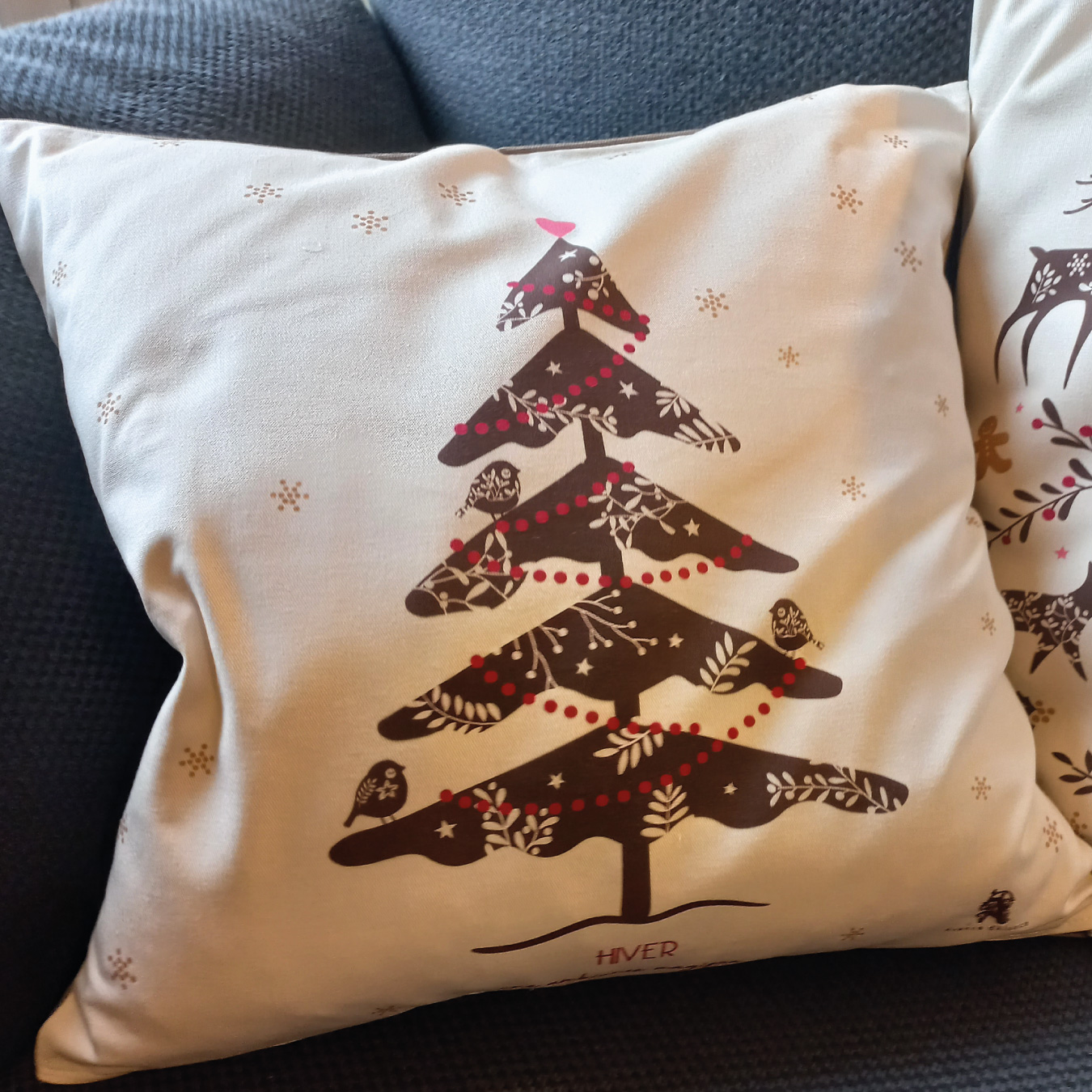 Ce coussin est imprimé d’un sapin décoré d’une guirlande lumineuse et de petits oiseaux, coloris rouge rosé, bordeaux et marron, sur fond écru.  Il est signé « hiver en Alsace, ambiance magique ». Dos uni .