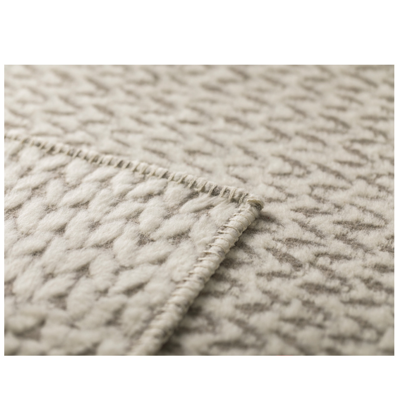 Le plaid est tissé , mais a un effet visuel  « tricot fil de  laine épaisse », aux reliefs velours doux, le tout dans une ambiance de couleur bicolore écru/taupe.