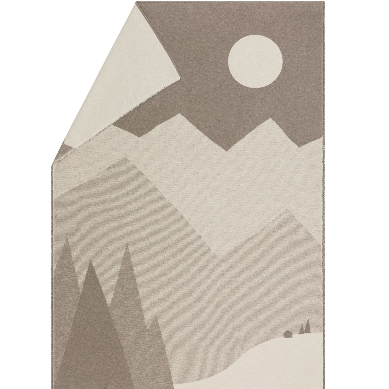 Plaid illustré d’un paysage de montagne et d’un chalet, avec la présence de la lune, le tout dans une ambiance de couleur bicolore écru/taupe.
