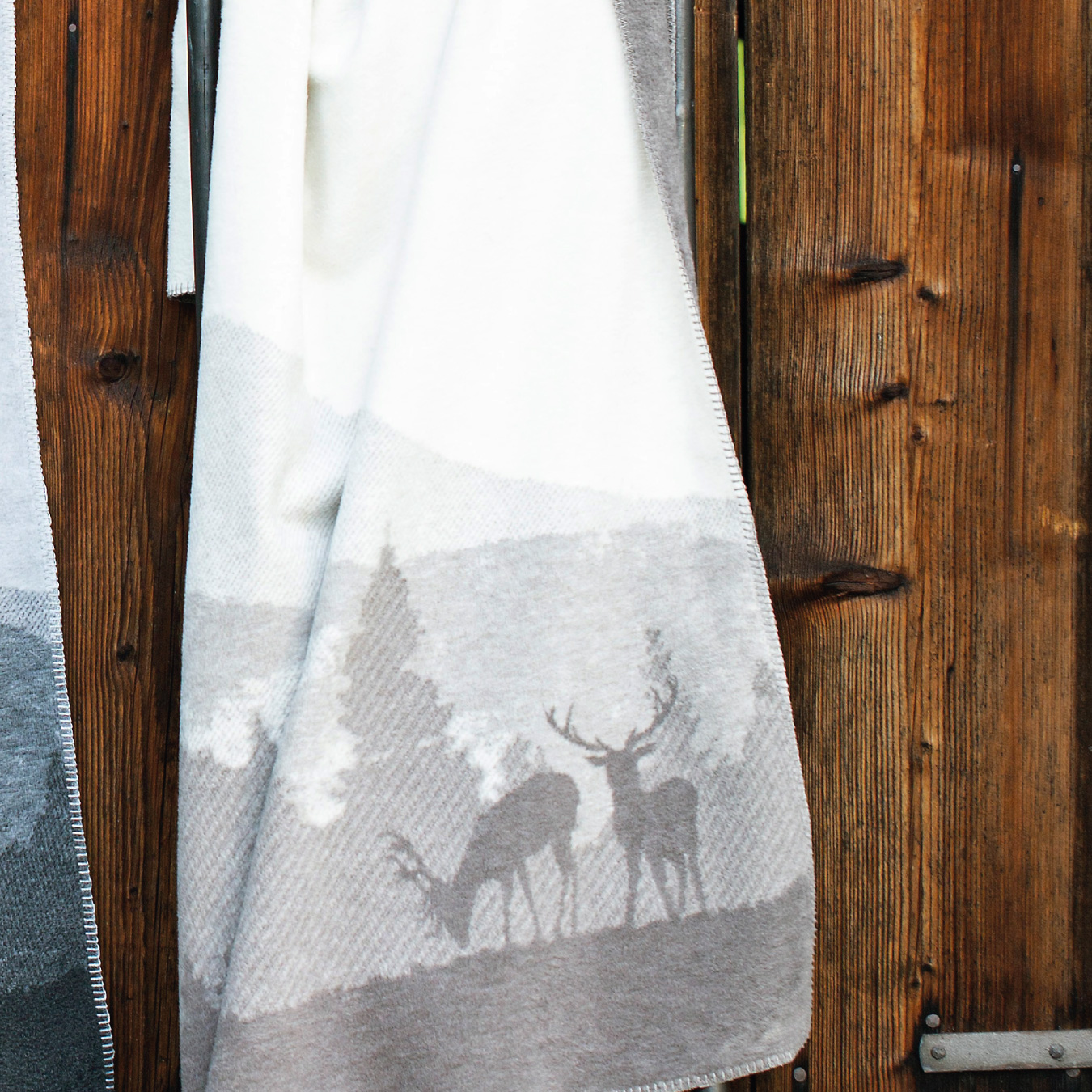 Le plaid d’un effet photo, est illustré de 2 cerfs devant la montagne, dans un dégradé de couleurs écru/taupe.