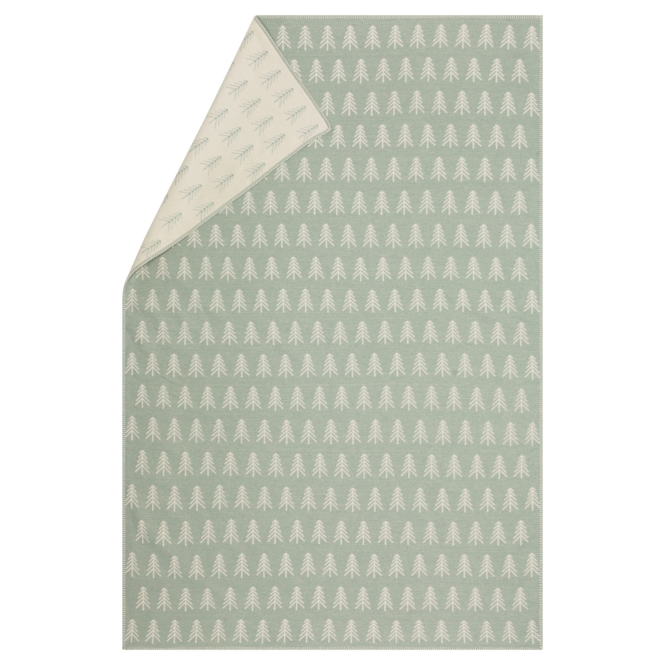 Le plaid présente un ensemble de petits sapins en relief velours couleur blanc cassé , sur un fond coloré vert pâle.